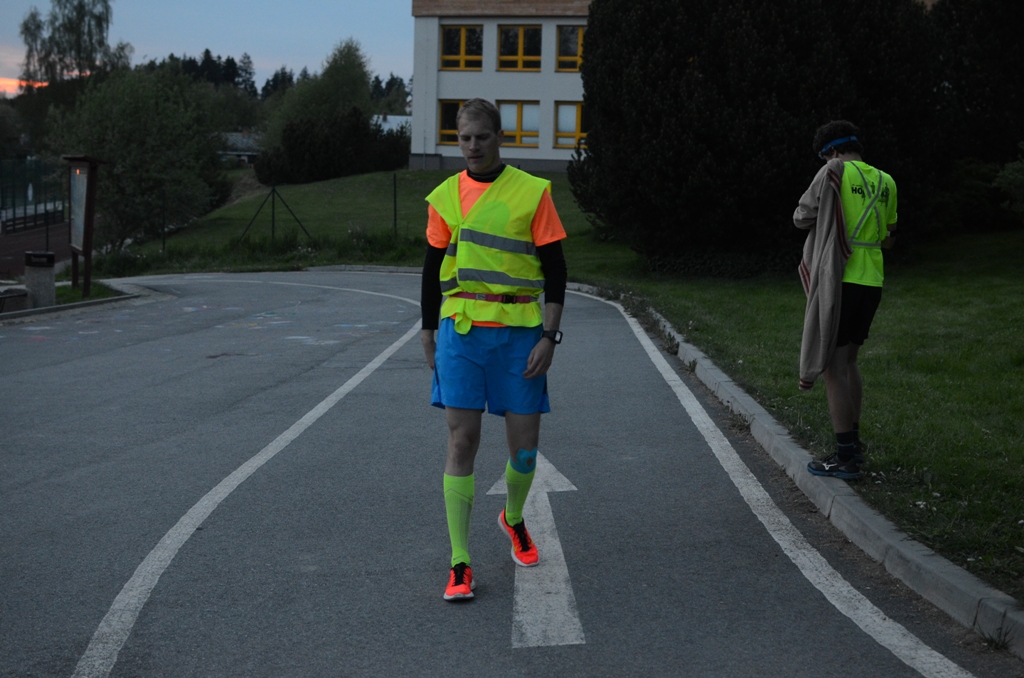 Už jsme dost sehraní, všichni víme, co dělat, známe naše role, všechno prostě hezky šlape. Já povětšinou řídím, Bára je spojař, navigátor, časoměřič, Petr nám se vším radí a Honza moc nemluví. O to rychleji teda běží! :)) Jak je nás už jen deset, mezery mezi autama se pomalu zmenšují. Odpočinku trochu míň. Zase se blíží ten kolotoč k nám. A já se jen modlím, ať se sluníčko v neděli probere co nejdřív, protože podruhý to za tmy už asi nedám. Naštěstí je to OK a v pět ráno mám čelovku zaplou jen z povinnosti a vybíhám na svůj úsek směr Týn n. Vltavou s finišem v Hostech. Předbíhám! Joo, předběhl jsem! Sice jen jednoho z pomalejšího teamu, ale skalp jako skalp, ne? Hnedka jde vidět ta parádní přátelská podporující se atmosféra. Já na kluka hulákám, ať maká a on na mě zase, že jsem dobrej! Pak už jen potkávám spícího hokejovýho fanouška na náměstí. To tak nějak vypovídá o tom, jak záživný závodění jsem prožíval. Taky mi to teda zdaleka neběželo podle představ. Asfaltová vlna znamenala neobvykle velkej kopec. No a kopec byla skoro zeď. A že už to úplná placka nebyla…Tep ne a ne dostat nad 168. Asi nějaká únava, že by? Tempo dávno v háji a v posledním dvou km stoupání, které teda bylo fakt výživný, si jen opakuju pro sebe, že teda ten třetí úsek mi jako už určitě podaří a teamu něco zajisté naženu. Nebo aspoň neztratím. Neztratím moc :)) Garminy hlásily 9,47 km, 41:40 min. No jo, tempo 4:24, to už nebyla žádná hitparáda, ale aspoň jsem se tentokrát nikde netoulal…ztráta na vítěze 6 minut. 19. místo.
