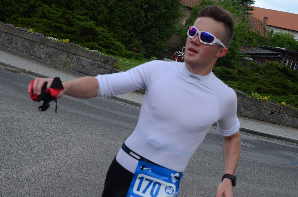 Třetí úseky se našemu autu motaly kolem Slap. Základnou nám byl Kamýk n. Vltavou, kde už to žilo rušným životem, opět máme spoustu času, který využíváme tak nějak napřeskáčku k odpočinku nebo socializaci (jo, přesně tak, mám selfie s Bárou a českým běžeckým guru. Jo, myslím toho Škorpila…). Benešovská pahorkatina slibovala kopce a taky pár lesních úseků, ne-li vyloženě traily. Obuv měním z asfaltové na hrubší vzorek a psychicky se připravuju na tu porcičku vertikálních metrů. Přebírám kolík od fenomenálního rychlíka Honzy u bývalé štoly Josef a na nic se nečeká, hnedka pěkně do lesa a do kopce a do kopce. Běžci, kteří vyběhli o pár minut přede mnou, jsou najednou za mnou. Trail do kopce střídá prudký seběh, potom asfaltový výběh, poté zase louka, les, prudký seběh a tak pořád dokola. Tady se teda organizátoři museli dost vyblbnout, fakt pestrá a parádní trať. Na jedné polňačce najedou za mnou slyším dupot. Ajaj, někdo má zálusk na můj skalp. Běžec z týmu motejlek.com, tuším. Stahuje mě a stahuje, ale já se přece nevzdám. Najednou přichází to, co mi doteď tak chybělo. Ten soupeř, s kterým se přetahuju. Jak kdyby mě někdo polil svěcenou vodou (ne, nepálí to) nacházím další síly a zvyšuju tempo i do kopce a ještě více na nejdelším asfaltovém seběhu, co jsem kdy zkusil. Ne a ne a ne, toho prostě nepustím a valím to, seč mi nohy stíhají. Přibíhám k Živohošťskému mostu, kde je finiš mé části a nechávám tam fakt všechno. Konečně jsou tu i fandící diváci a ten most mi přijde neskutečně dlouhej! Nějaká fanynka na mě huláká, že už jenom na konec mostu a mám to letos za sebou! Nebyla to úplně pravda, protože mi hrozil i čtvrtej úsek, ale naštěstí k tomu nedošlo… 🙂 Z běhu mám fakt super pocit. Připadalo mi, že jsem letěl. Jenže jak tak koukám na čísla, tak jsem letěl jenom druhou půlku, když mi někdo dýchal na záda. Škoda ztráty 11 minut na prvního a umístění až na 40. fleku. Tempo 4:58 by byla na rovině ostuda, ale tady v těch lesích se mi to zdálo dobrý…finiš kolem 3:40 odpovídal pocitově vynaložené námaze 😀 Naměřeno 10,61 km a 52:39 minut. Pocity: nenaměřeno, to ještě přístroje neumí, ale kdyby to šlo, byl bych na bedně… :)) Opravdu krásný zážitek tahle necelá hodinka kolem Slap.