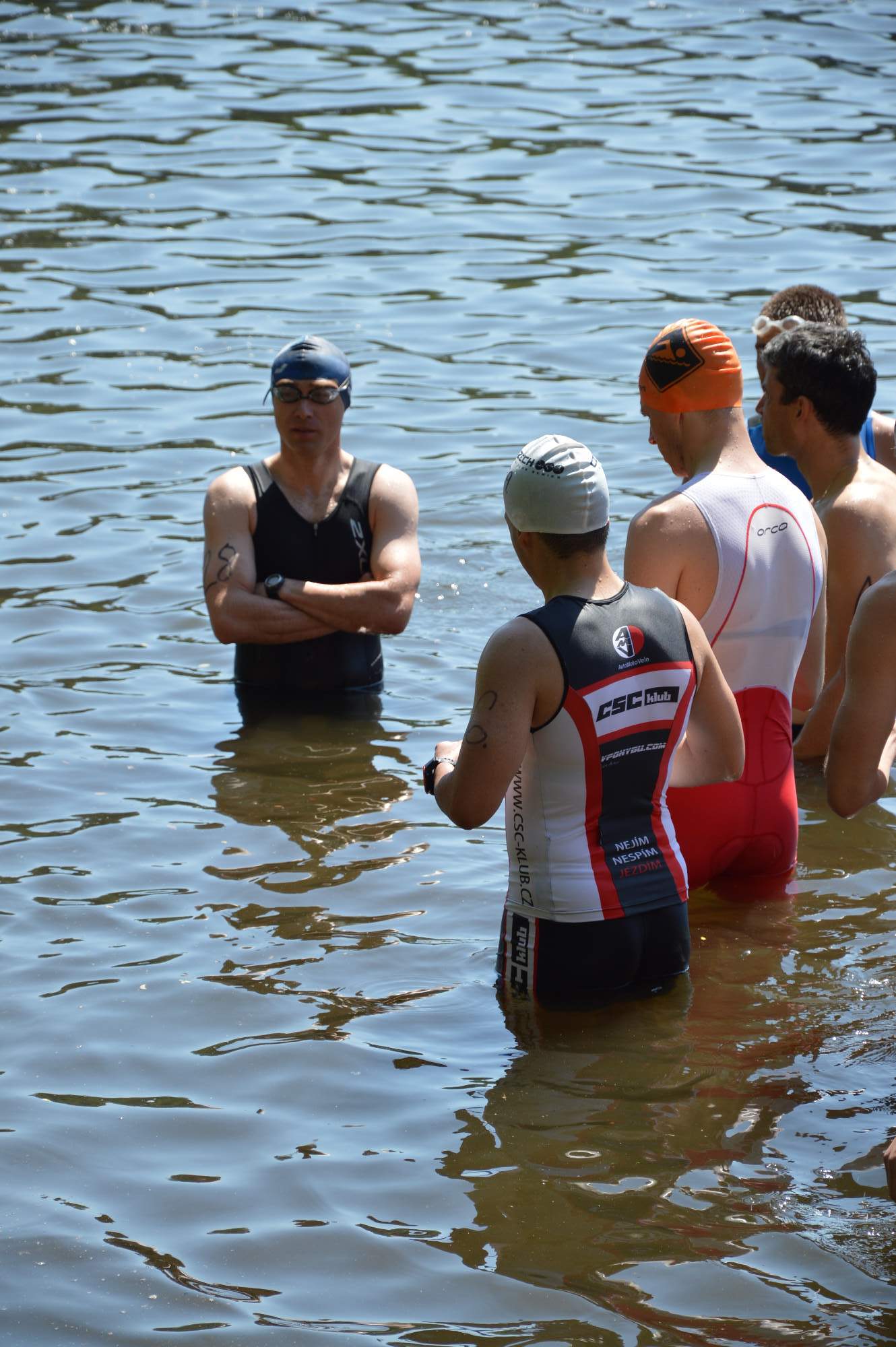 Příprava: Terénní triatlon pro mě má jednu zásadní nevýhodu. Koná se v terénu! Já nemám ani horský kolo a neseděl jsem na něm snad od dětství 🙂 Miloš byl ale tak hodnej a půjčil mi jeho kousek. Sice trochu menší, ale na tu jedna sranda akci by to mohlo stačit. Jen jsem si přehodil pedály, abych mohl použít moje (silniční) tretry a povytáhl sedlovku do výše. Na místo jsem dorazil včas, abych za a) všechno stihl a za b) abych si prohlídl terén. Vyfasoval jsem číslo 2, jedničku dostal obhájce titulu z dvou předešlých ročníků Jarda. Depo se plní závodníkama a horskýma kolama, i pár fanynek dorazilo… 🙂 Jdu se rozjet kousek po trase a vracím se asi za 15 minut se slušnou bahnivou ozdobou na těle a zděšeným výrazem v obličeji, protože jsem zjistil hned za rohem, že trasa kola bude malinko techničtější! 🙂 Trochu se protáhnout, rozklusat a jdu zkusit vodu.