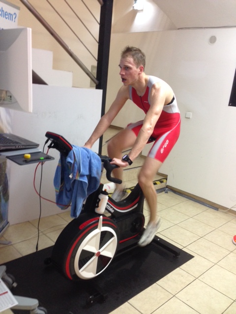 Cyklistika 13,58 km: (Uváděných 15 km není úplně přesně, jak jde vidět z čísel níže.) Po plavání tradičně motání hlavy. Naštěstí se z trenažéru nedá zrovna snadno spadnout 🙂 Díky domácímu tréninku s watty na trenažéru jsem měl představu o mém možném výkonu, nicméně na wattbiku v E.Labu to šlo záhadně lépe a šlapal jsem více. Průběh cyklistiky byl v pohodě, až jsem se divil, ale jak se říká, neříkej hop…přišlo finální stoupání…s velkým S. Rychlost šla raketově dolů, já se snažil držet stejný výkon a nevšímat si ostatních čísel na monitoru. I když přiznám, bylo to demotivující jak blázen 😀 Konečný průměrný číslo výkonu 275 W mně překvapilo. Nicméně mu odpovídala taky vysoká tepovka, rezerv už moc nebylo, žádný flákání. Taky se závodil supersprint, žádný ironman, ne? 🙂 Oproti loňsku jistě zlepšení, ale díky jiné použité trase na CycleOps i jinému trenažéru to nemá cenu srovnávat v číslech. Čas 28:52 minut – spokojenost!
