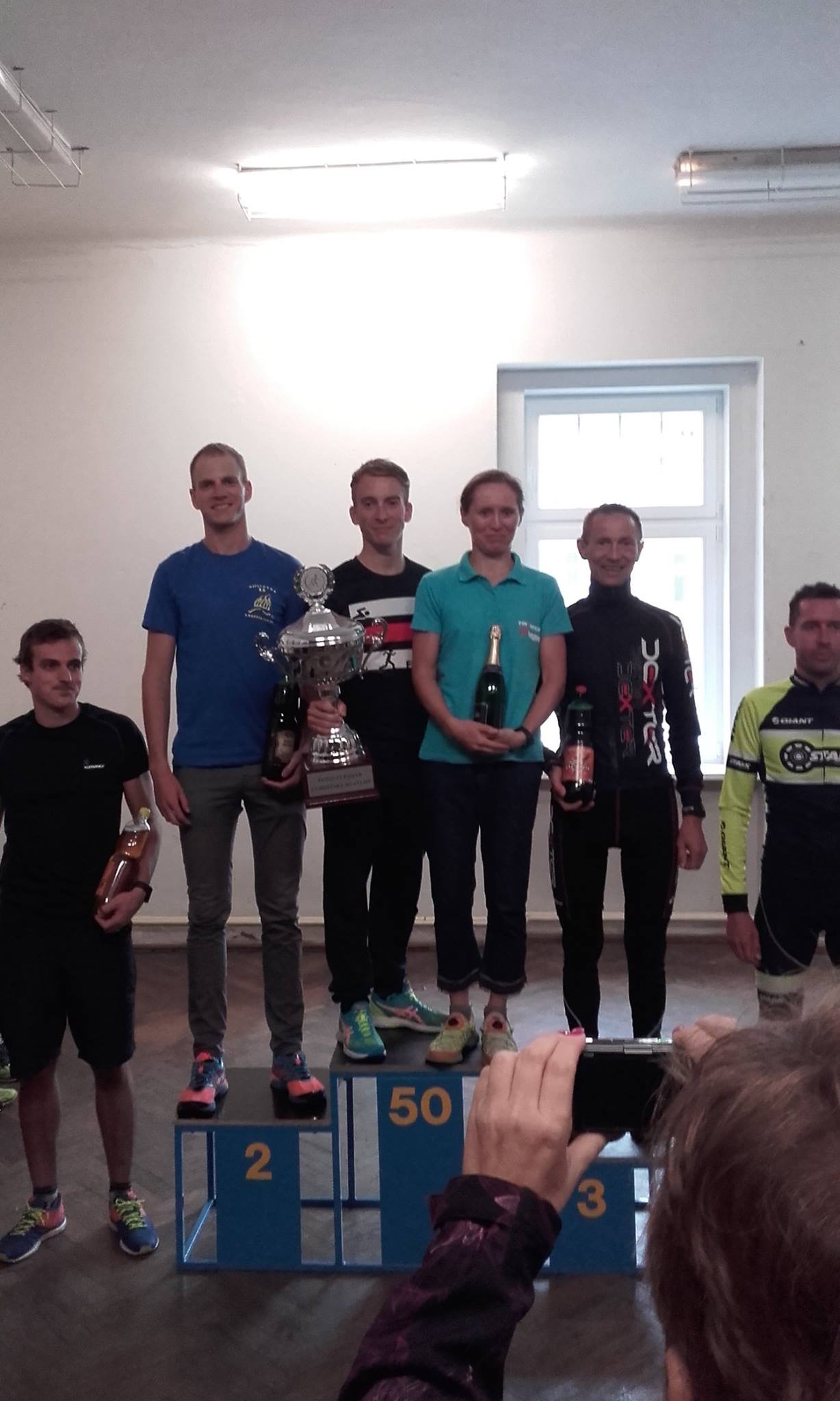 Do Unhoště jsme se vydali s berounskýma borcema bratrama Gojovýma, kteří přijeli obhajovat 1. a 3. místo. Počasí teda pod psa. Trasa byla ale nesmírně zábavná. Běh 2 a 2 km kolem rybníka s mírným kopcem do depa. Cyklistika cca 15 km v 5ti(!) kolečkách připomínala závody kritéria. Děsná sranda, utíkalo to fakt rychle. První běh jsem si hlídal druhé místo za Radimem (Gojem), díky rychlému depu jsem vyrážel na kolo jako první. Dotíral ale hnedka, s kterým jsme se chvilku střídali a hnedka nás doplnil Radim. S Radimem jsme se společně trhli, ale nestačil jsem mu. Myslel jsem si, jak už je to v pohodě, ale nechal jsem se vyškolit od skupinky za mnou, která mě dojela těsně před cílem cyklistiky a na druhý běh jsem najednou vyrážel až ze čtvrtého/pátého místa. Musel jsem to trochu osolit (tempo kolem 3:40-5), abych se zase vrátil za Radima, který měl ale už nesmazatelný náskok kolem 3/4 minuty. Přetahoval jsem se ale s o generaci starším Frantou Bulavou. Boj se rozhodl až ve finálním kopečku do finiše a nechal jsem ho za sebou o pouhý 2 vteřiny. Ten mi ale dal zabrat! 🙂