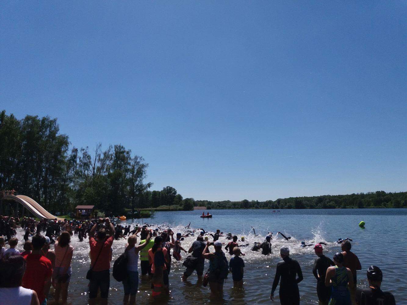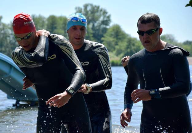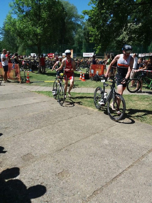 Plavání 700 m: Šel jsem na to tentokrát úplně jinak než dříve. Doprostřed do davu, mezi první a druhou řadu. Start byl o loktech, ale pak jsem se vezl s vlnou triatletů. Kdybych nedostal i kopance do obličeje, považoval bych to za ideální start do závodu 🙂 Ke břehu jsem plaval něco přes 11 min, můj místní osobáček (časomíra není u břehu…). Asi teda zafungovala nová strategie! (12:02 min, 86. pozice/197 mužů)