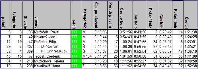 TTT s zelenými čepičkami od začátku tvrdilo muziku, když se Pája vynořil z rybníku v Černínech jako druhý, ale na kolo nasedá už jako první! Ale nebyl rozhodně sám, hnedka v patách mu byl Jarda Pejsar a Tomáš Martínek. Jen o několik málo okamžiků později už leze ven náš Honza Novotný…