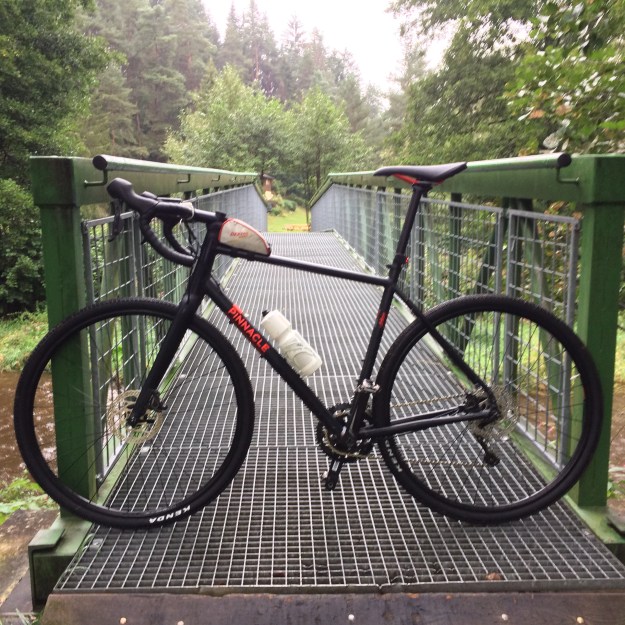 Takže tady ho mám(e), matně černý Pinnacle Arkose (specifikace 2 pro rok 2017). Hliníkový rám s geometrií odvozenou od cyklokrosky, ale s více podkopnutou karbonovou vidlí, delším rozvorem, níže položenou osou šlapání. Bezpečný prostor pro úžasných 45 mm pláště. Osazení pro specifikaci 2 je sada Tiagra 2×10 s převody 32/48 a kazetou 11-32, kotoučové hydraulické brzdy Shimano, bezdušová kola s obutými gravel plášti Kenda 35 mm. Vepředu pro zvýšení tuhosti pevná osa 12 mm, vzadu klasický rychloupínák. V téhle sestavě nějakých 10 kg hmotnosti.