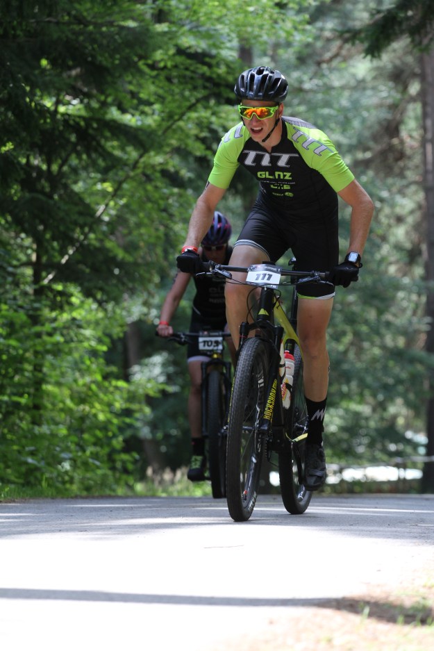 Prvních 10 km, po kterých následuje občerstvovačka, uběhlo až neskutečně. Po nich přijde slušně náročný výjezd ze Záblatí, kterej je jednak technicky ne úplně easy a sklon hovoří jasně: kašpárek game 😀 Tam jsem si věřil, měl najetou stopu, chtěl jsem být první v nejtěžší části. Byl jsem zapracovaný ve skupině cca 5 lidí. Takže jsem do toho šlápl, vynechal občerstvení, zbaštil vlastní gel a šel před ostatní. Bohužel po pár minutách nohy začly vysvětlovat, že to dneska fakt nemůže být 100% 🙂 Trochu jako debil jsem předjel jednoho chlápka a následně mi chcíply nohy. No, stane se, sorry. Každopádně jsme to všichni zvládli bez ztráty kytičky, ale člověk by tam nechal plíce…kdyby už nebyly v prd…i tak! Biková část byla teprve v 1. třetině z 32 km. S dalšíma kilometrama jsem se rozjel a i nohy začaly lépe a lépe spolupracovat a předjíždělo se…asi nejtěžším úsekem biku je tzv. Prachatický hřebínek, úsek s úzkým trailem plným větších kamenů a kořenů, které dají zabrat nejednomu. Předchází mu ale krátký, nicméně neskutečně prudkej výjezd, kterej jsem nakonec zvládl jenom v tréninku a v závodě i přes všechnu snahu a fandění fanoušků se mi splašil můj Canyon a neudržel jsem ho v kýženým směru rovně nahoru :)) Hřebínek už vyšel solidně, následný traily nahoru i dolů taky parádně a finální sjezd z lesa jsem se dokonce blýskl časem hnedka za mistrem světa Ruzafou! Ach ty malé radosti…trvající 40 vteřin…musíme je nacházet, že 😀 Každopádně celkově bajkovačka to byla luxusní, žádný MTB závod by se za ní nemusel stydět! A nakonec ani já…až na detaily mi to sedlo a do druhého depa jsem 81. časem (1:46 hod) stáhl 28 míst.