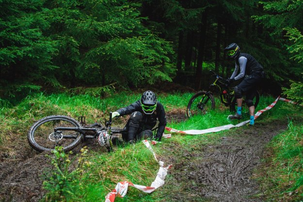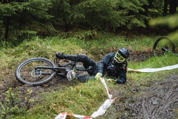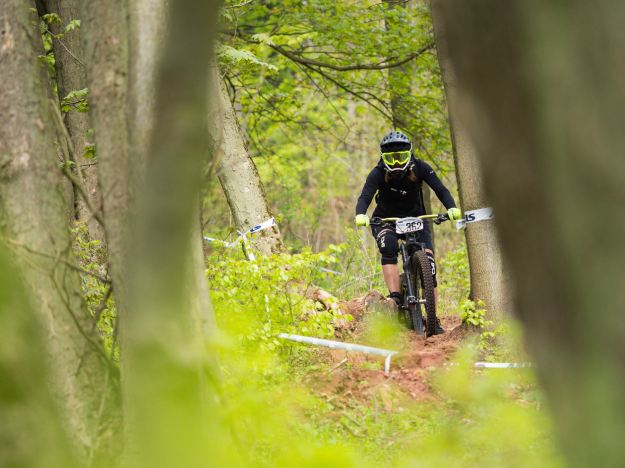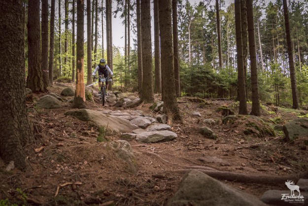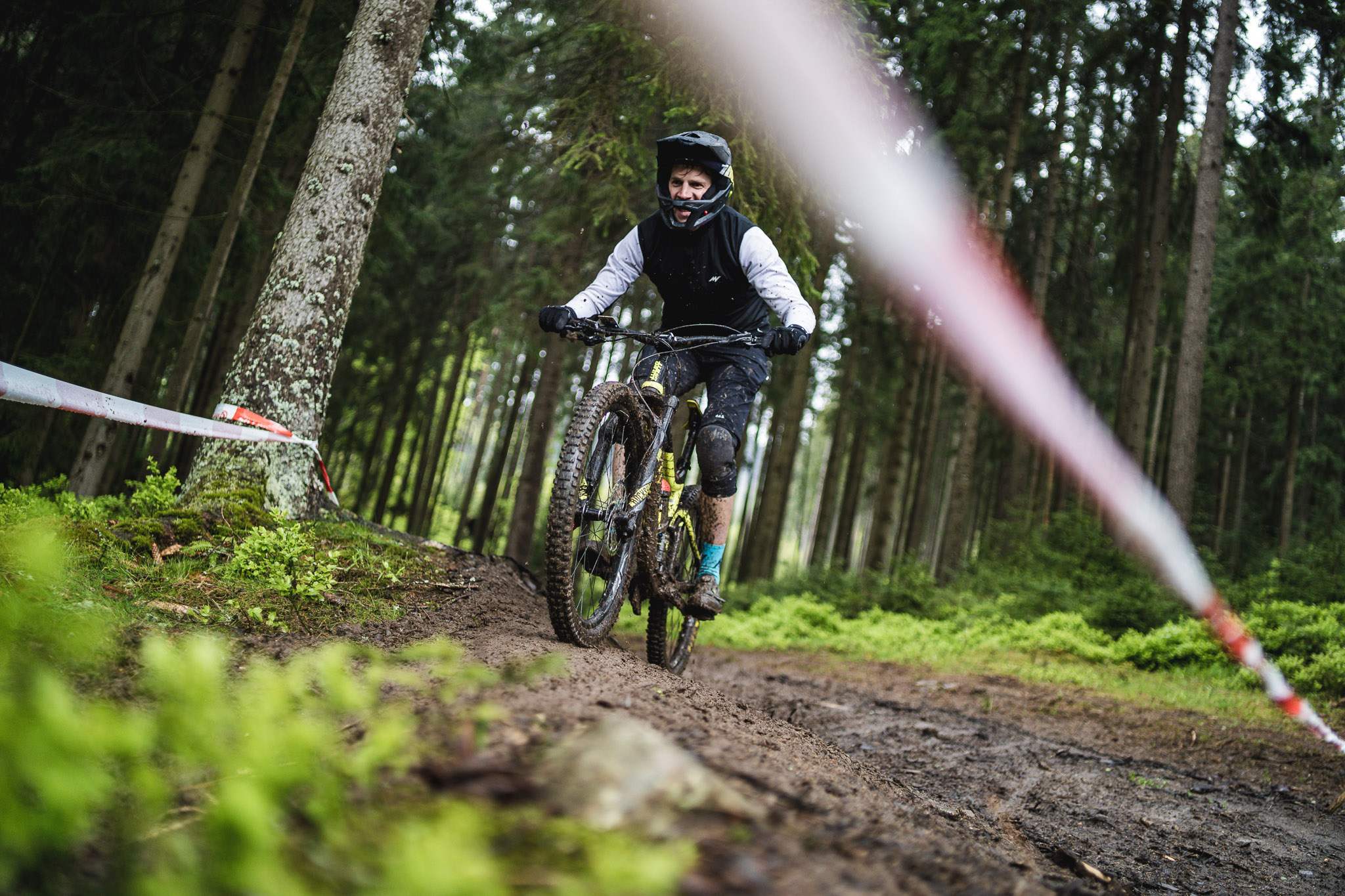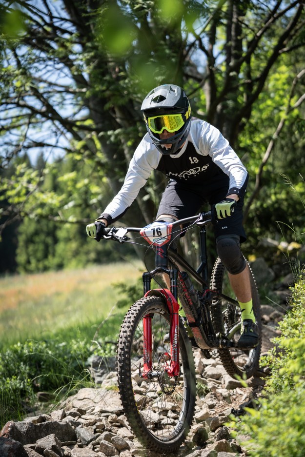Závod samotný bych pak rozdělil na dvě části – RZ1 a RZ2 “do zídky” v půlce a pak zbytek. Přijde mi, že si ty největší špeky na nás připravili právě do první půlky. Místní stavitelé se vyžívají hlavně v rock gardenech, kterýma byla posetá hlavně dvojka, ale byla k nalezení i na jedničce a trojce. Na jedničce nechybí pověstný Temelínský drop a dost rychlých, prudkých pasáží s kompresema. Udělal jsem několik větších záseků, takže slaboučké. Ve dvojce jsem nějak přečkal rock garden, kterou jsem si nedokázal natrénovat na čistotu a pak už jen doufal, že ustojím kamennou zídku, kde jsem volil variantu “nic nevymýšlet a jet rovně”, která oplývala především jednoduchostí plánu a nakonec docela i provedením 😃 Zbytek závodu už byl enduristickou radostí i pro mě, celá čtyřka pro mě byla úplným synomymem pro 100% RZtu. Start z rampy jak na svěťáku DH, velká rock garden, dlouhý, dlouhý čerstvý úseky v lese, místama s pěkným sklonem a ani skoky nechyběly. Čtyřka měla nějakých 5,5 minuty, prostě boží! Celej závod jsem zvládl zajet na jistotu bez nějaký krizovky, takže i pomalu, v rámci elity VELMI pomalu, ale hnedka po odjetí RZ5 (která byla taky peckovní!) jsem se mohl plynule přidat k rodinný oslavě bez přidaných obvazů, apod., takže celková spokojenost… 🙂