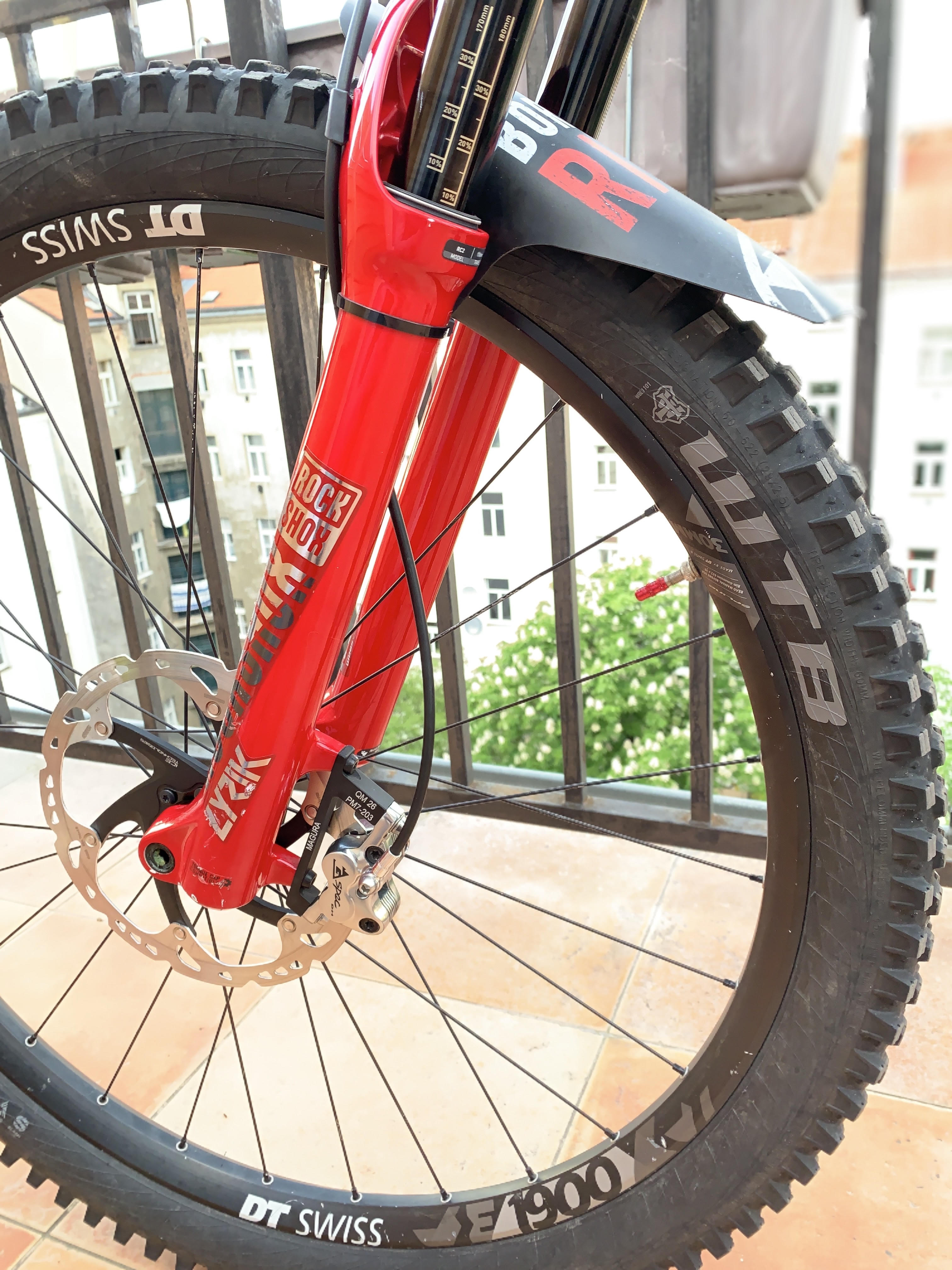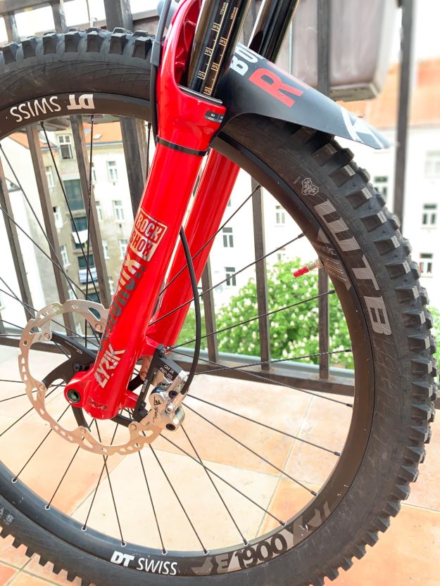 Rockshox Lyrik RC2 170 mm, foukáno 92 psi, jeden token (ze 4 možných), pomalá komprese 3 kliky od otevřeného, rychlá komprese úplně otevřená, odskok 12 kliků od otevřeného.